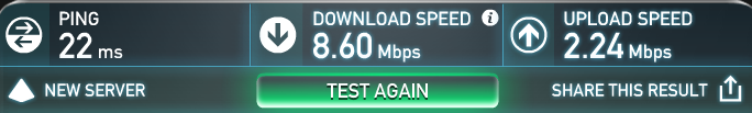 上图选择的是香港的服务器,测试ping延迟数据仅21ms,download speed速度为9.26Mbps,Upload speed为2.22Mbps.要知道小编的带宽是铁通10M,下载速度能达到9.26可以说基本没有什么丢失。